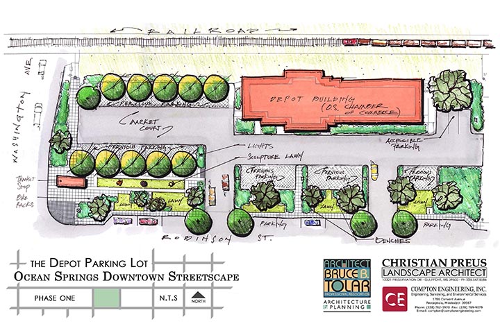 Along with the design team of Architect Bruce Tolar and Compton Engineering, Christian Preus Landscape Architecture (CPLA) transformed many areas of Downtown Ocean Springs. The overall streetscape project focused on the improvement of the Depot parking lot, Keyes Park, the major intersections, and Government Street.